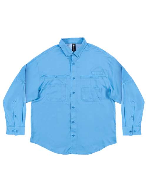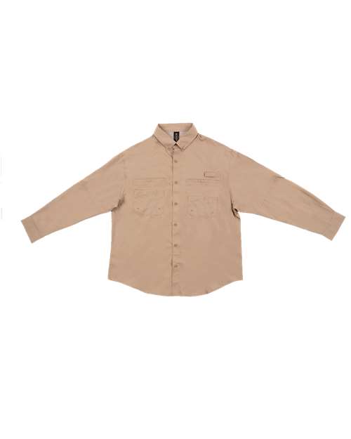 2 2  oz /yd² 100% ripstop polyester Moisture management  properties UPF 40+ protection Antimicrobial properties Mesh lined half back with vertical vent openings Extra large chest pockets Lower cargo style pockets with eyelets Roll up sleeves with loop closure